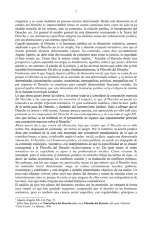 Este documento presenta una introducción a la teoría del derecho. Primero, distingue tres dimensiones del fenómeno jurídico: la normativa, la valorativa y la social. Luego, discute las concepciones no marxistas sobre el derecho, las cuales tienden a ignorar el contenido de clase y la vinculación del derecho con las luchas sociales y las relaciones económicas. Finalmente, argumenta que el derecho no puede reducirse a meras normas, sino que también refleja valores y tiene un contenido social e ideológico.
