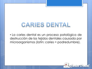 La caries dental es causada por la interacción de varios factores como la placa bacteriana, la dieta, la saliva y la susceptibilidad del huésped. Los microorganismos de la boca producen ácidos a partir de los azúcares de la dieta que desmineralizan el esmalte y la dentina dental sobre periodos de tiempo prolongados.