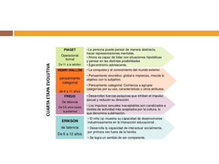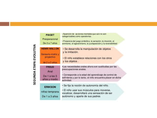 Este documento resume la teoría educativa de Henri Wallon, psicólogo francés que desarrolló una teoría del desarrollo infantil basada en estadios. Explica los principios de desarrollo y aprendizaje de Wallon, incluyendo sus cuatro factores clave y sus leyes del desarrollo. Describe los seis estadios de desarrollo propuestos por Wallon y cómo se relacionan con factores como la motricidad, emociones, pensamiento y lenguaje. Finalmente, resume las aportaciones de Wallon a la