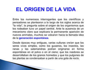 La teoría de Oparin y Haldane explica el origen de la vida a través de la existencia de una atmósfera primitiva rica en gases, donde se formaron moléculas orgánicas complejas llamadas "coacervados". Estos coacervados pudieron evolucionar hasta formar las primeras células, modificando la atmósfera. Experimentos posteriores como los de Miller simularon con éxito estas condiciones primitivas y produjeron moléculas características de los seres vivos.