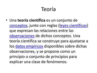 El documento compara y contrasta teorías, leyes naturales, principios y modelos en el contexto de la ciencia. Una teoría científica es un conjunto de conceptos y leyes que explica fenómenos basándose en datos empíricos, mientras que una ley natural es una teoría comprobada que describe el comportamiento del universo. Los principios son generalizaciones científicas sobre procesos específicos y los modelos son representaciones visuales de eventos y conceptos.
