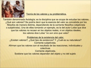 El documento presenta una discusión sobre la teoría de los valores. Explora diferentes perspectivas sobre la naturaleza y existencia de los valores, incluyendo si son subjetivos u objetivos. También examina problemas como el método para estudiar valores, si existe una jerarquía objetiva de valores, y qué tipo de conocimiento permite captar los valores. El documento también resume críticas al respecto y propone que los valores deben revisarse dinámicamente de acuerdo a los cambios sociales.