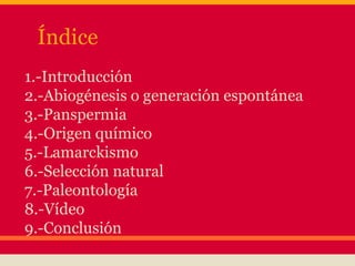 Este documento resume varias teorías sobre el origen de la vida, incluyendo la abiogénesis o generación espontánea, la panspermia, el origen químico, el lamarckismo y la selección natural. También discute la paleontología y cómo estudia los fósiles para reconstruir las formas de vida pasadas y su evolución a través del tiempo. El documento concluye esperando haber explicado claramente estas teorías sobre el origen y evolución de los seres vivos.