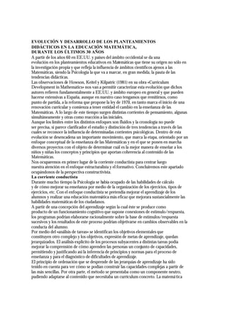 El documento describe la evolución de los enfoques didácticos en la educación matemática durante los últimos 30 años, influenciados por corrientes psicológicas. Inicialmente prevaleció el enfoque conductista, centrado en habilidades de cálculo. Luego surgió el enfoque estructuralista, que buscaba enseñar las estructuras conceptuales subyacentes a las matemáticas. Finalmente, el constructivismo piagetiano influyó en concebir las matemáticas como un proceso de construcción del conocimiento por parte del estud