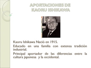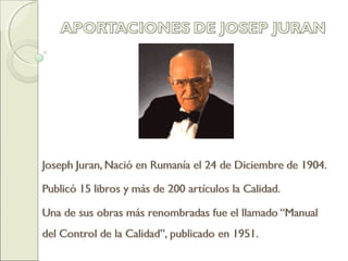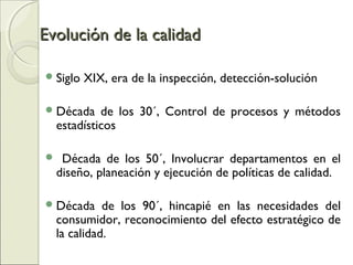 1) El documento describe la evolución histórica de los conceptos y teorías de calidad desde el siglo XIX hasta la actualidad, incluyendo las contribuciones de pioneros como Deming, Juran y Taguchi. 2) Explica conceptos clave como calidad total, costos de calidad, control estadístico de procesos y círculos de calidad. 3) El enfoque ha evolucionado de la inspección a satisfacer las necesidades del cliente de manera estratégica.