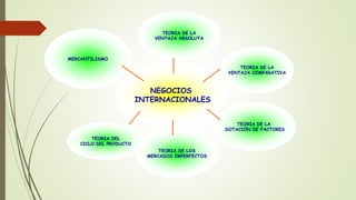 Este documento presenta varias teorías clave del comercio internacional. La primera teoría es el mercantilismo, que promovía el control gubernamental del comercio para acumular riqueza a través de superávits comerciales. Otras teorías incluyen la ventaja absoluta de Adam Smith, la ventaja comparativa de David Ricardo, la dotación de factores de Heckscher-Ohlin, los mercados imperfectos, y el ciclo de vida del producto de Theodore Levitt.