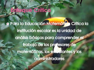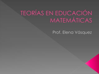 Este documento presenta una breve introducción a varias teorías y enfoques en educación matemática. Resume las ideas principales de Piaget sobre el aprendizaje, el constructivismo radical, el constructivismo social, la teoría crítica y la etnomatemática. También describe brevemente la obra de Brousseau y la escuela holandesa de educación matemática.