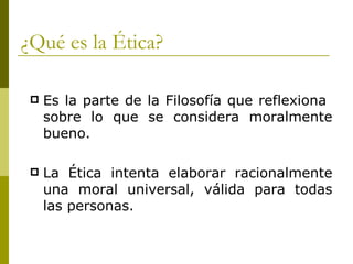 Este documento resume las principales teorías éticas. Las divide en éticas materiales o teleológicas, que se enfocan en la búsqueda de la felicidad, y éticas formales o deontológicas, que se centran en el deber moral. Entre estas últimas se encuentra la ética kantiana, que propone que una acción es moral si se realiza con la intención correcta, siguiendo el imperativo categórico. Otra teoría es el existencialismo, que defiende que el ser humano debe asumir su libertad y respons