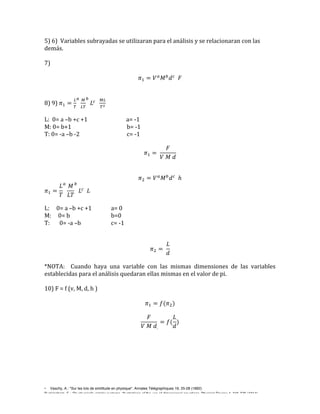 El documento explica el Teorema de Buckingham, un método para encontrar relaciones entre variables mediante el análisis adimensional. Se describen los pasos para aplicar el teorema, que incluyen identificar las dimensiones de las variables, determinar el número de parámetros adimensionales y establecer ecuaciones para encontrar sus exponentes. Se incluye un ejemplo para ilustrar cómo se implementa el método.