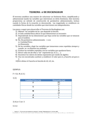El teorema de Buckingham establece un método para simplificar y adimensionalizar las variables que intervienen en un fenómeno físico, incluso cuando la forma de la ecuación es desconocida. El método implica identificar las variables relevantes, sus dimensiones físicas, y construir parámetros adimensionales que relacionen las variables de manera que se eliminen las unidades. Se provee un ejemplo paso a paso para ilustrar la aplicación del teorema.