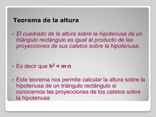 Este documento presenta el Teorema de las alturas y catetos para triángulos rectángulos. Explica que la altura sobre la hipotenusa es igual a la raíz cuadrada del producto de las proyecciones de los catetos, y que los catetos son iguales a la raíz cuadrada del producto de la hipotenusa por su proyección correspondiente. A continuación, resuelve varios problemas aplicando estos teoremas.