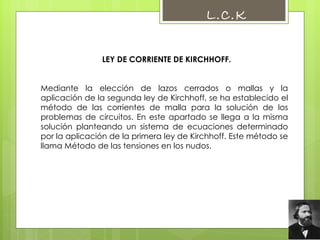 Este documento describe el método de las tensiones en los nudos para resolver circuitos eléctricos. Explica que se asignan números o letras a los nudos y se elige un nudo de referencia. Luego, se escriben ecuaciones aplicando la primera ley de Kirchhoff a cada nudo principal, excepto el de referencia. Esto genera un sistema de ecuaciones igual al número de nudos principales menos uno que se puede resolver para encontrar las tensiones en cada nudo.