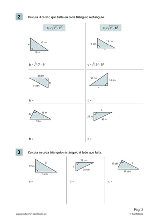 El documento explica el Teorema de Pitágoras, que establece que en un triángulo rectángulo, el cuadrado de la hipotenusa es igual a la suma de los cuadrados de los catetos. A continuación, presenta ejemplos de cálculos para hallar lados desconocidos en triángulos rectángulos y problemas de aplicación del teorema.