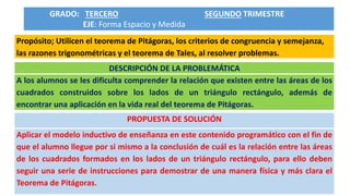 Este documento describe un modelo inductivo de enseñanza para ayudar a los estudiantes a comprender la relación entre las áreas de los cuadrados construidos sobre los lados de un triángulo rectángulo y aplicar el teorema de Pitágoras para resolver problemas. Bajo este modelo, los estudiantes siguen instrucciones paso a paso para descubrir por sí mismos estas relaciones y cómo usar el teorema. El documento proporciona ejemplos de problemas y sus soluciones usando el teorema de Pitágoras.