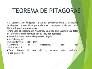 El teorema de Pitágoras establece que en un triángulo rectángulo, la suma de los cuadrados de los catetos es igual al cuadrado de la hipotenusa. Este teorema es útil para calcular lados desconocidos en triángulos rectángulos mediante la fórmula c2=a2+b2, donde c es la hipotenusa y a y b son los catetos. Se proveen ejemplos como calcular la longitud de una escalera o la diagonal de un cuadrado.