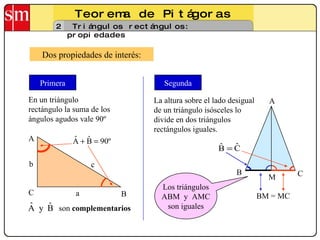 El documento explica el Teorema de Pitágoras a través de 13 secciones. Introduce el teorema, muestra cómo se aplica a triángulos rectángulos, incluyendo dos demostraciones geométricas. Luego presenta ejemplos numéricos para calcular lados desconocidos y diagonales de cuadrados, rectángulos y triángulos isósceles. Finalmente explica cómo usar el teorema para hallar la altura de un hexágono regular.