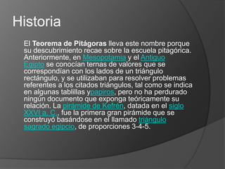 El documento presenta una breve historia del Teorema de Pitágoras, incluyendo su descubrimiento por la escuela pitagórica y ejemplos anteriores en Mesopotamia y Egipto. Luego describe los diferentes tipos de demostraciones del teorema, como algebraicas, geométricas y dinámicas. Finalmente, brinda información biográfica sobre Pitágoras, fundador de la escuela pitagórica y origen del famoso teorema.