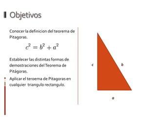 Este documento presenta información sobre el Teorema de Pitágoras. Explica la historia del teorema, su definición formal, diferentes demostraciones geométricas del teorema, y aplicaciones del mismo a triángulos rectángulos notables. También incluye actividades de ejemplo y una bibliografía de referencia.