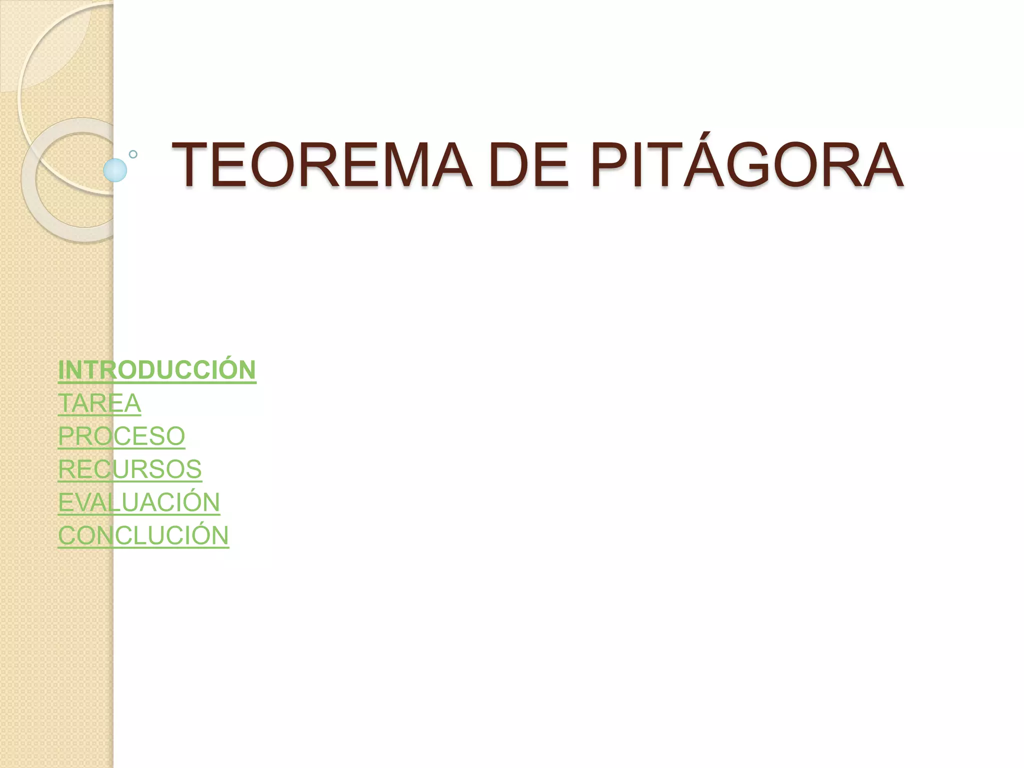 Este documento presenta las instrucciones para una actividad escolar sobre el Teorema de Pitágoras. Los estudiantes prepararán una conferencia en 5 partes para sus compañeros: 1) Usarán un rompecabezas para demostrar visualmente el teorema, 2) Comprobarán el teorema en triángulos rectángulos usando un geoplano, 3) Explicarán demostraciones visuales, 4) Presentarán problemas resueltos con el teorema, 5) Entrevistarán a Pitágoras sobre su vida y obra. El documento