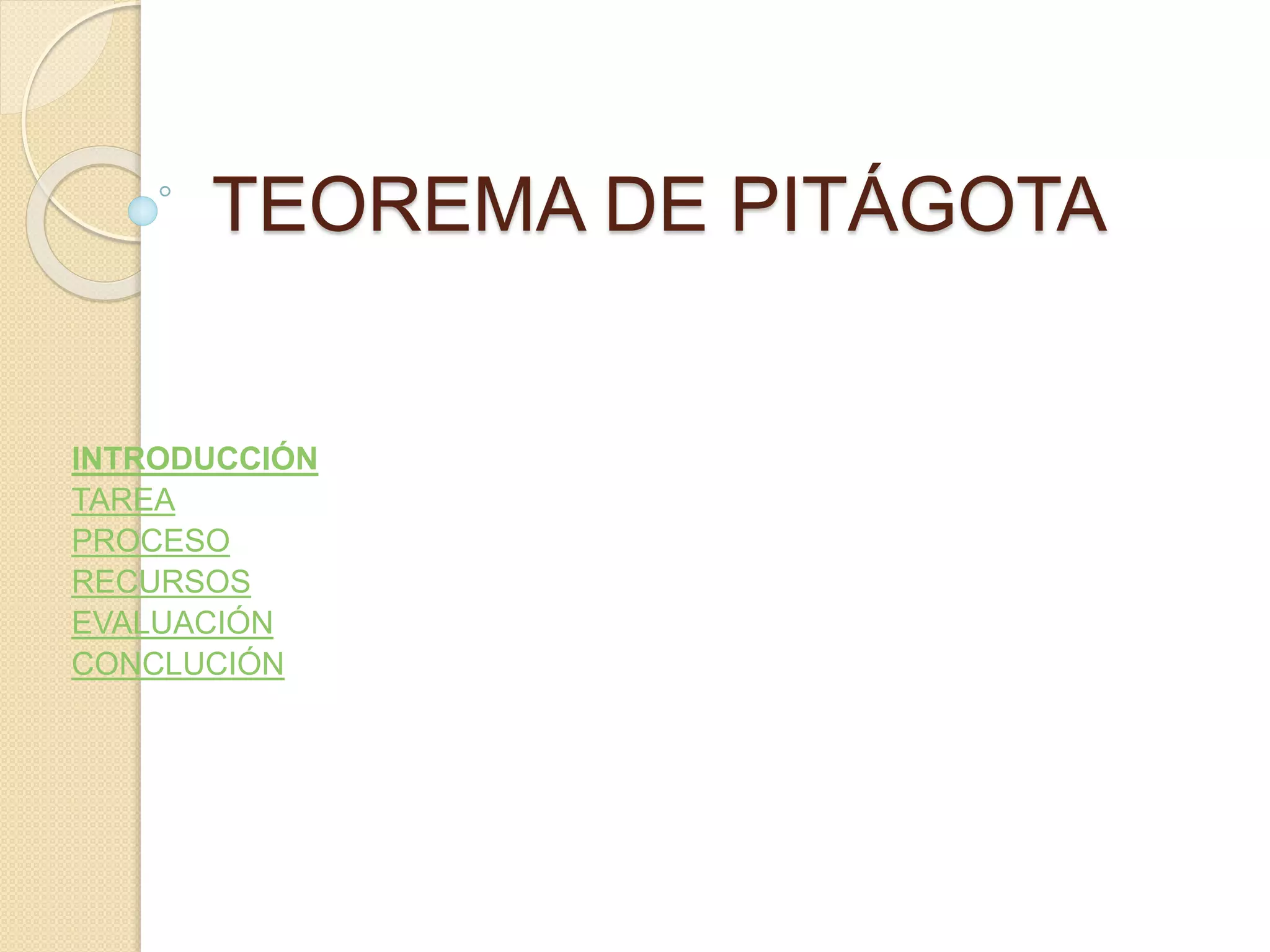 Este documento presenta las instrucciones para una actividad escolar en la que dos estudiantes prepararán una conferencia sobre el Teorema de Pitágoras y sobre la vida y obra de Pitágoras para presentar a sus compañeros. La conferencia constará de cinco partes: 1) una demostración visual del teorema usando un rompecabezas, 2) comprobar que solo se aplica a triángulos rectángulos, 3) otra demostración visual, 4) ejemplos de problemas resueltos con el teorema, y 5) una entrevista
