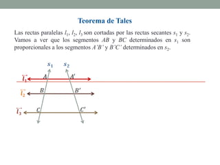 El Teorema de Tales establece que si varias rectas paralelas son cortadas por dos secantes, los segmentos determinados por dichas paralelas en una secante son proporcionales a los segmentos determinados en la otra secante. El teorema puede utilizarse para resolver problemas geométricos encontrando longitudes desconocidas mediante la formación y resolución de proporciones.