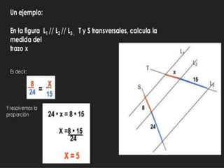 El documento presenta el Teorema de Tales, el cual establece que si una línea paralela es trazada a cualquier lado de un triángulo, se obtiene un triángulo semejante al original. Como ejemplo, se muestra cómo el teorema se aplica a las sombras proyectadas por un árbol y el sol. La bibliografía incluye dos enlaces web sobre el Teorema de Tales y sus aplicaciones.