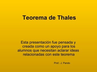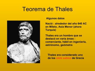 Este documento presenta la biografía y los principales logros de Thales de Mileto, incluyendo el desarrollo de su famoso teorema geométrico. Explica que Thales fue un polímata griego del siglo VII a.C. conocido por ser uno de los Siete Sabios de Grecia. También describe cómo Thales utilizó proporcionalidades para medir la altura de las pirámides y sentó las bases del concepto de demostración matemática. Finalmente, resume el Teorema de Thales, que establece que los segmentos