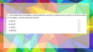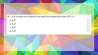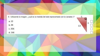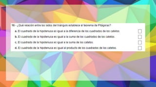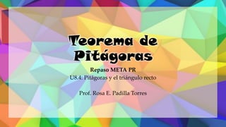 Este documento proporciona una explicación del Teorema de Pitágoras. Explica que Pitágoras fue un matemático griego que descubrió que en un triángulo rectángulo, la suma de los cuadrados de los catetos es igual al cuadrado de la hipotenusa. A continuación, proporciona ejemplos para demostrar cómo aplicar este teorema para calcular el lado desconocido de un triángulo rectángulo. Finalmente, incluye ejercicios de práctica para que los estudiantes apliqu