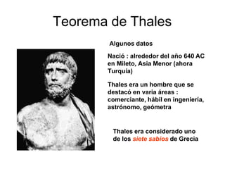 El documento describe el Teorema de Thales, atribuido al matemático griego Tales de Mileto. Explica que Thales observó que los triángulos formados por objetos y sus sombras son similares cuando la luz incide de forma paralela, lo que llevó al desarrollo de su teorema sobre segmentos proporcionales en rectas paralelas cortadas por transversales. También presenta ejemplos de aplicación del teorema para calcular longitudes desconocidas.
