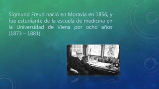 Sigmund Freud nació en 1856 y estudió medicina en la Universidad de Viena por ocho años. Se especializó en el tratamiento de desórdenes mentales y fue discípulo del psiquiatra Jean Martin Charcot. Freud desarrolló la teoría del psicoanálisis y estudió la mente inconsciente, interpretando sueños y la personalidad. Propuso etapas psicosexuales en el desarrollo y que las experiencias de la niñez afectan el comportamiento.