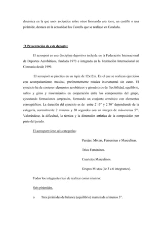 El acrosport es un deporte que involucra acrobacias y elementos gimnásticos realizados en cooperación entre los miembros de un grupo. Se practica en un tapiz de 12x12 metros con música y consiste en la ejecución de pirámides humanas, series acrobáticas, saltos y otros elementos individuales. Promueve valores como la creatividad y la cooperación entre los participantes.