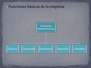 El documento resume los principios generales de la administración según Henry Fayol. Identifica las funciones básicas de la empresa y las funciones del administrador como planear, organizar, dirigir, coordinar y controlar. También describe conceptos clave como la división del trabajo, autoridad y responsabilidad, y la unidad de mando y dirección.