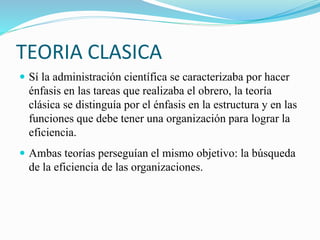 La teoría clásica de la administración surgió en Francia y se caracterizó por el énfasis en la estructura organizacional para lograr eficiencia. Henri Fayol fue el fundador de esta teoría y propuso seis funciones básicas y catorce principios generales, incluyendo la división del trabajo, autoridad y responsabilidad, y unidad de mando. Aunque la teoría clásica buscaba la eficiencia, también recibió críticas como su enfoque mecanicista y por no considerar plenamente el comportamiento humano
