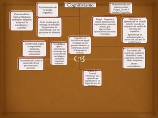 El documento resume los fundamentos de la teoría cognitiva, la cual estudia los procesos mentales del aprendizaje. Explica que autores como Piaget, Vigotsky y Ausbel fueron representantes de esta teoría. Se describe que Piaget propuso cuatro etapas del desarrollo cognitivo y que Vigotsky consideró que el lenguaje es esencial para el aprendizaje. Ausbel promovió un aprendizaje significativo en lugar de uno de memoria.