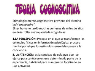 El documento presenta una introducción a los conceptos cognitivos y su desarrollo a lo largo de las diferentes etapas de la vida. Explica brevemente los procesos de percepción, atención, memoria, lenguaje y otros, así como las teorías de Piaget sobre el desarrollo cognitivo en las etapas de la infancia y la adolescencia. Finalmente, aborda temas como el conocimiento físico, lógico-matemático y social, y la relación entre el desarrollo cognitivo y las neurociencias.
