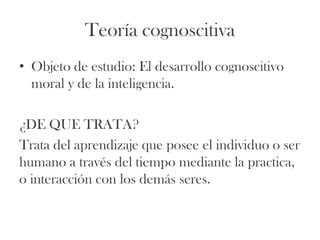 La teoría cognitiva trata sobre el desarrollo cognitivo y moral a través del aprendizaje y la interacción. Jerome Bruner impulsó la psicología cognitiva y desarrolló la teoría del andamiaje, donde los estudiantes aprenden descubriendo por sí mismos. Piaget elaboró una teoría del desarrollo cognitivo en etapas. Ausubel argumentó que el aprendizaje es más efectivo cuando se relaciona con los conocimientos previos del estudiante.