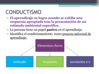 El conductismo propone que el aprendizaje se produce a través de la asociación estímulo-respuesta. Identifica el condicionamiento como el proceso fundamental de aprendizaje, ya sea a través del condicionamiento clásico de Pavlov o el condicionamiento operante de Skinner. El aprendizaje ocurre cuando se presenta un estímulo y el sujeto responde de forma adecuada, recibiendo una consecuencia de refuerzo.
