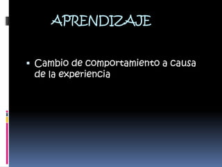 Este documento resume la teoría conductista del aprendizaje. Explica que el aprendizaje es un cambio de comportamiento causado por la experiencia. Los principales representantes fueron Ivan Pavlov, John Watson, Edward Thorndike y Burrhus Skinner. Pavlov descubrió el condicionamiento clásico a través de sus experimentos con perros. Watson propuso que el aprendizaje se produce a través de la asociación de estímulos y respuestas. Thorndike introdujo la ley del efecto y del ejercicio. Finalmente, Skinner desar