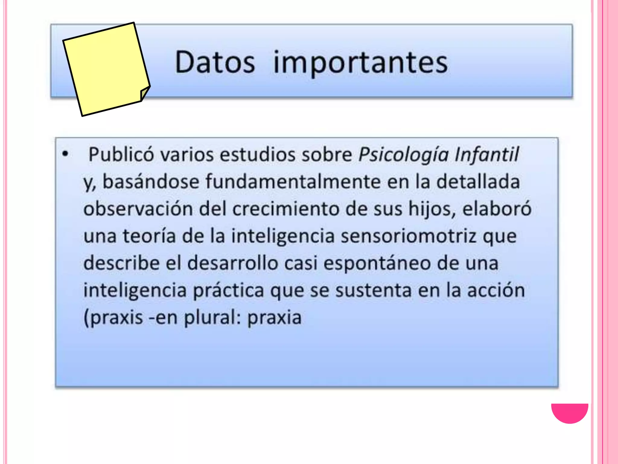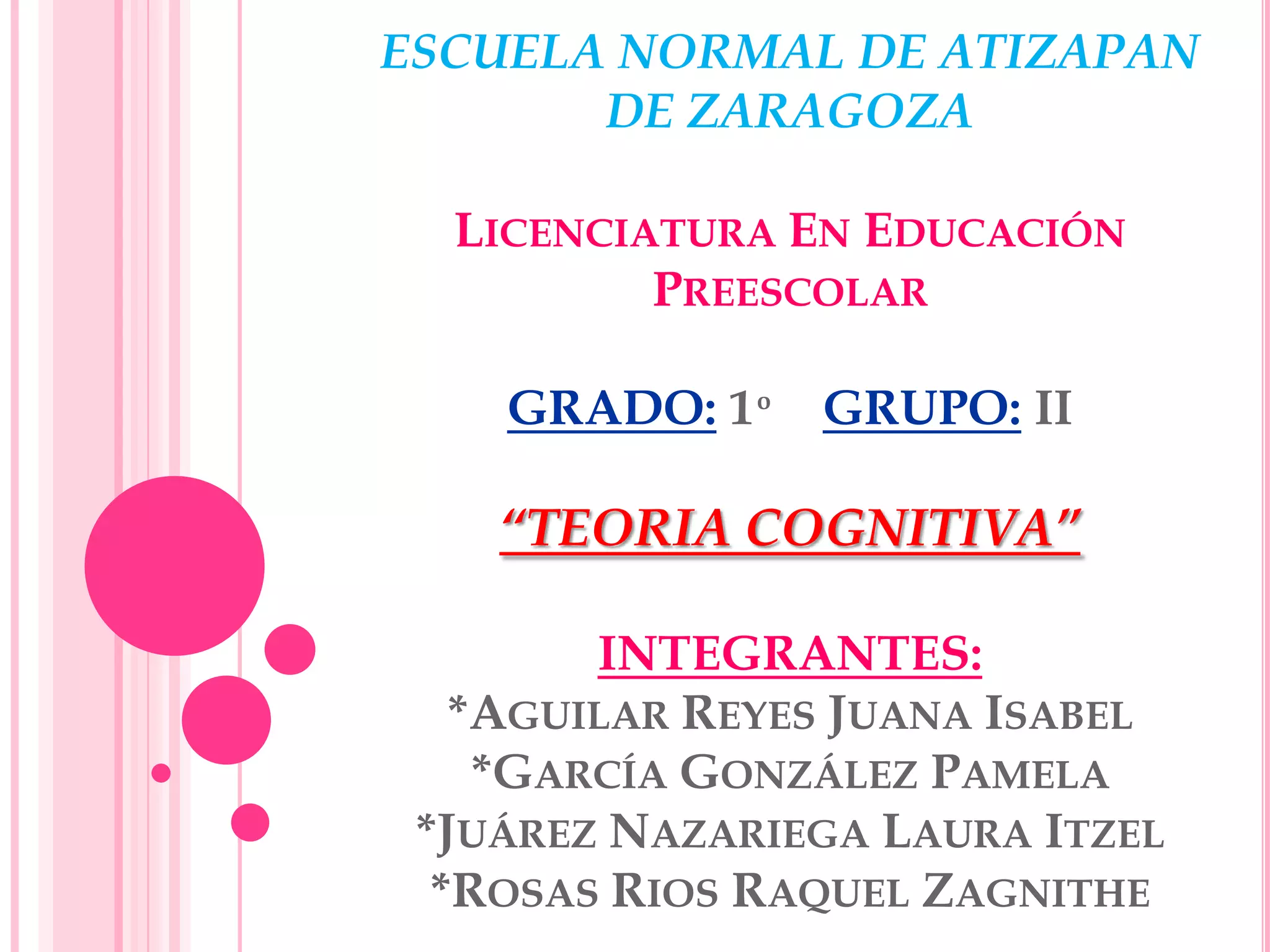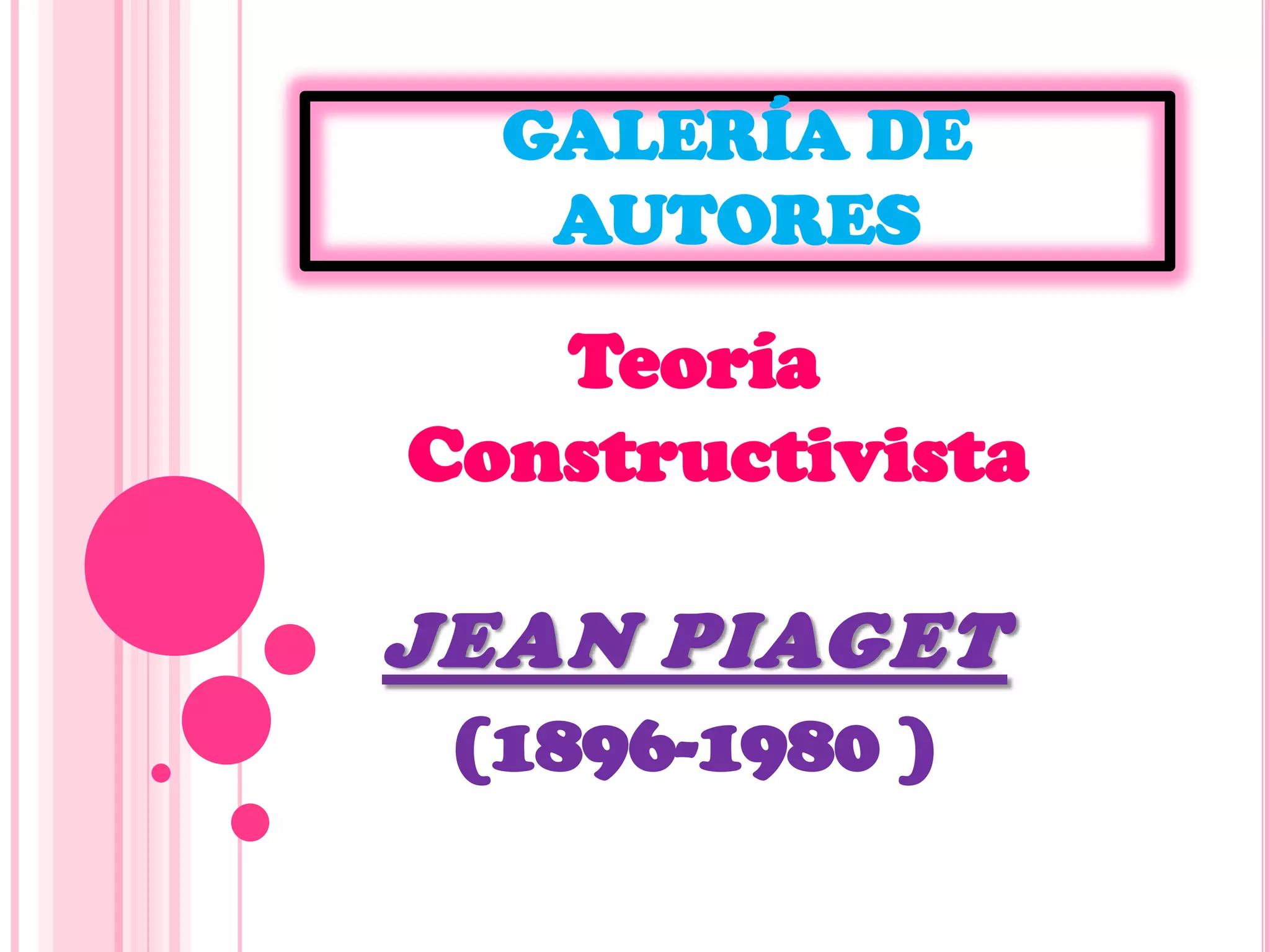 Este documento presenta información sobre la teoría cognitiva de Jean Piaget. Explica que Piaget fue un psicólogo suizo que desarrolló la teoría constructivista del desarrollo cognitivo infantil. Según Piaget, el desarrollo cognitivo ocurre a través de etapas maduracionales, jerárquicas y genéticas que involucran la interacción del niño con su entorno. También describe los principales hallazgos, obras y supuestos de la teoría de Piaget.