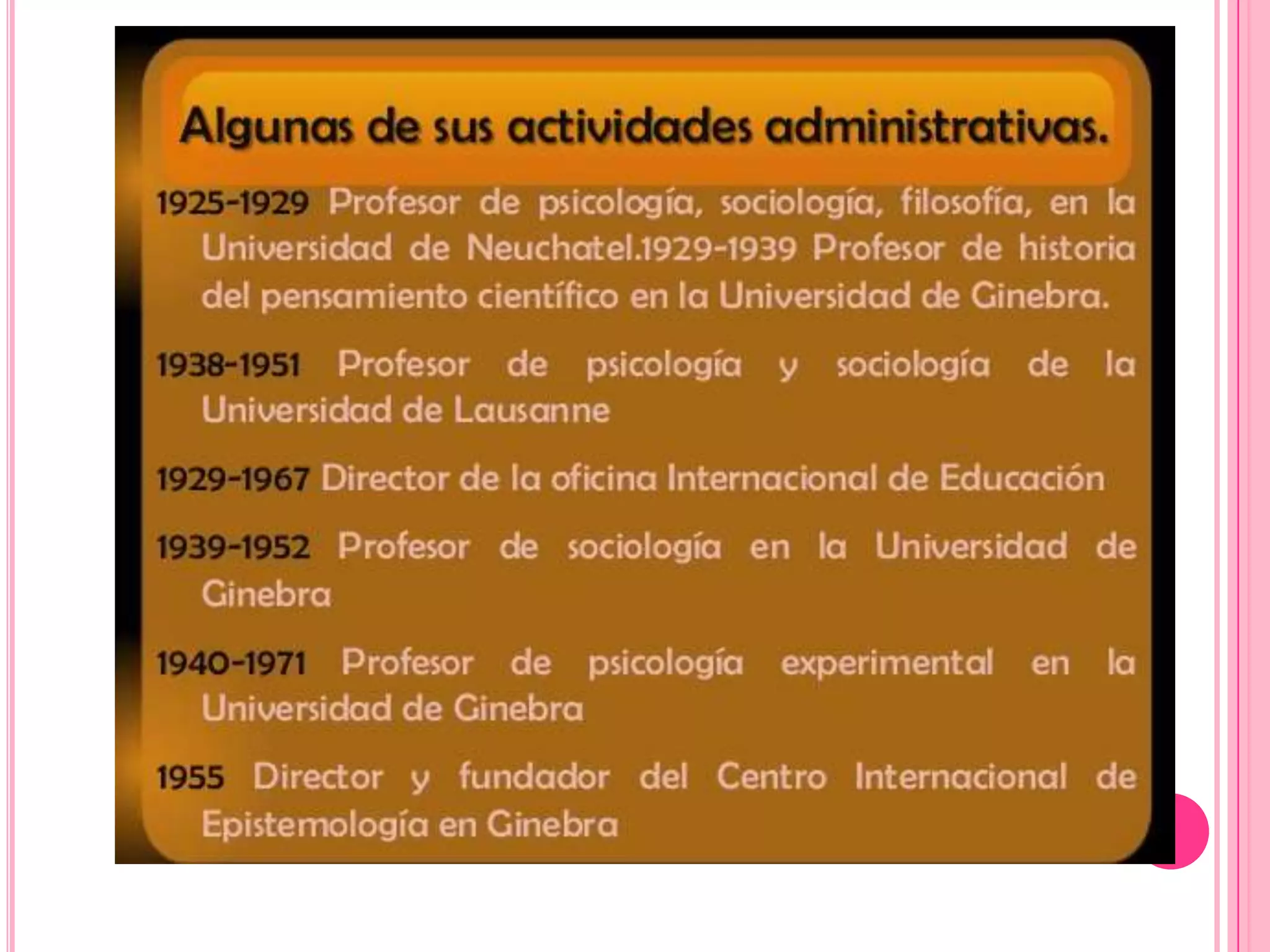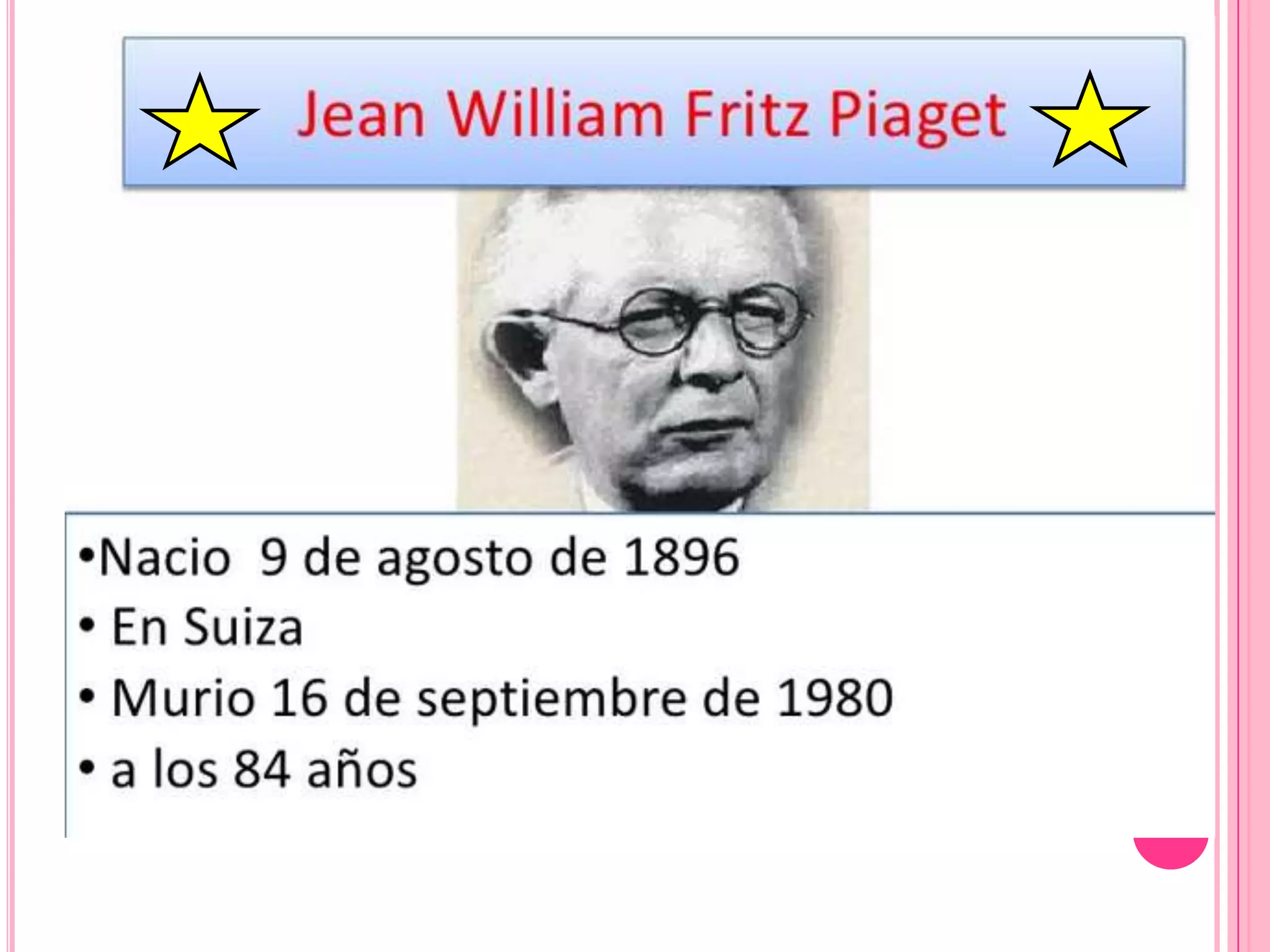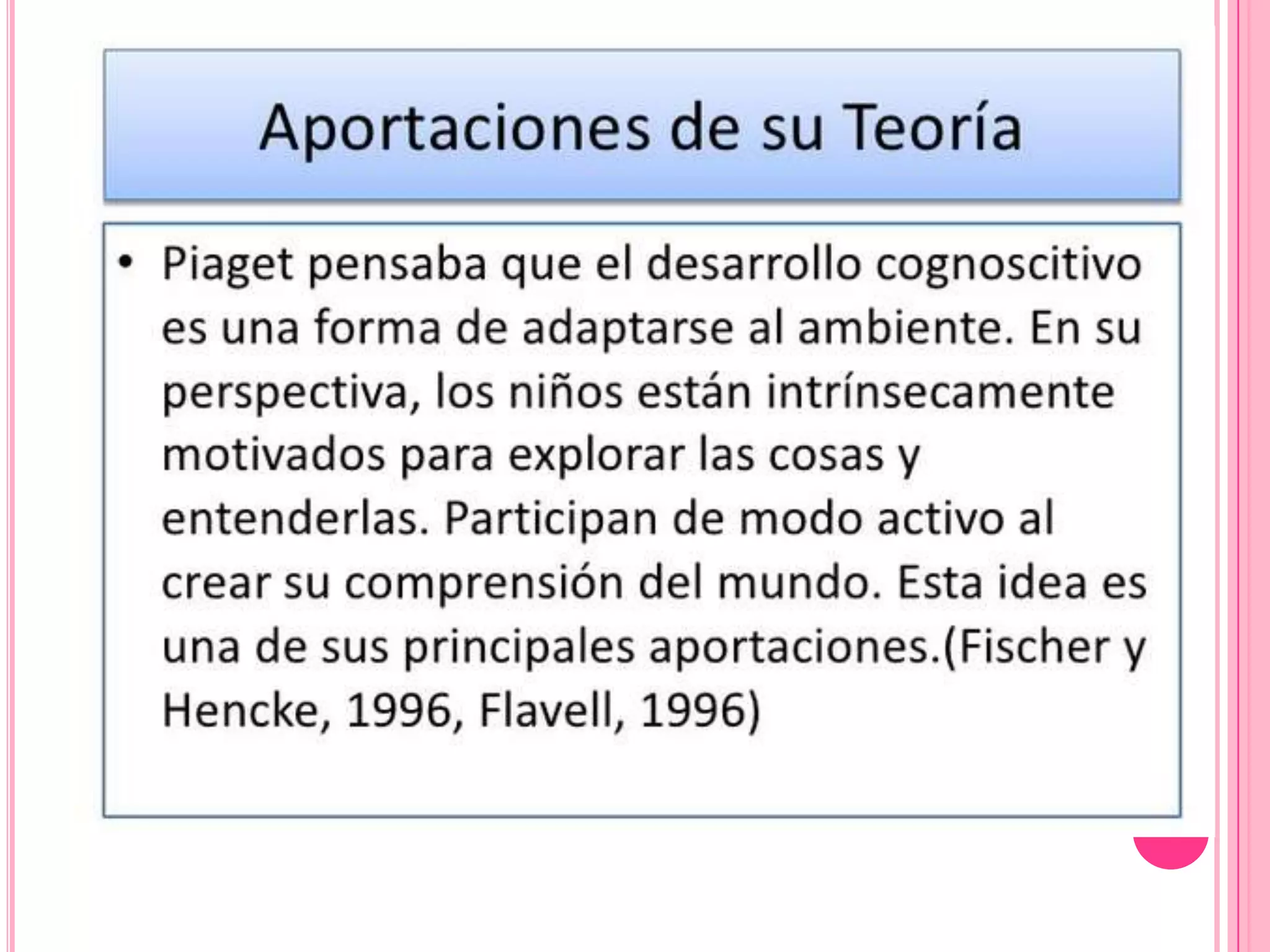 Este documento presenta información sobre la teoría cognitiva de Jean Piaget. Explica que Piaget fue un psicólogo suizo que desarrolló la teoría constructivista del desarrollo cognitivo infantil. Según Piaget, el desarrollo cognitivo ocurre a través de etapas maduracionales, jerárquicas y genéticas que involucran la interacción del niño con su entorno. También describe los principales hallazgos, obras y supuestos de la teoría de Piaget.