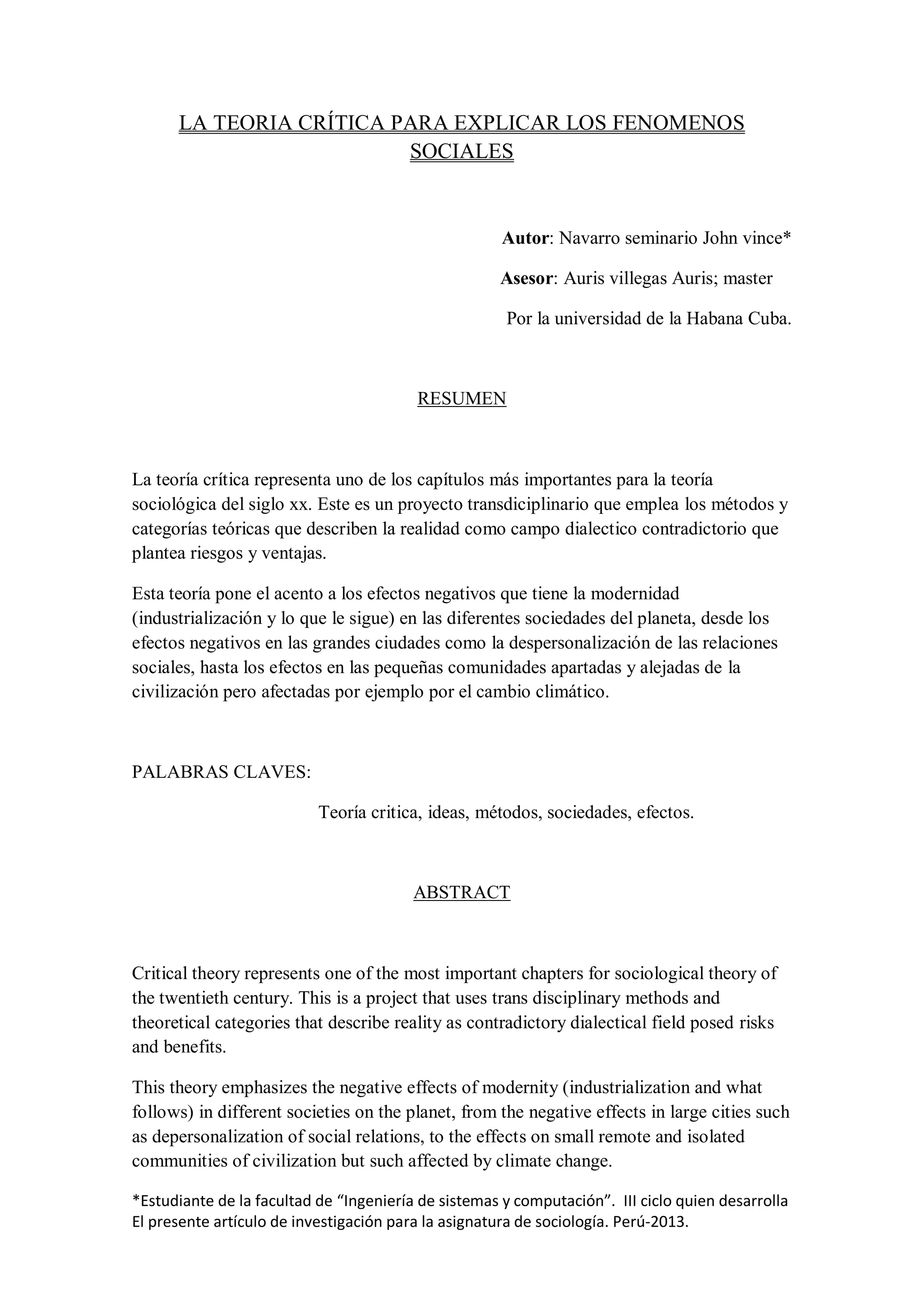 La teoría crítica representa uno de los capítulos más importantes para la teoría sociológica del siglo XX. Este es un proyecto transdiciplinario que emplea los métodos y categorías teóricas que describen la realidad como campo dialectico contradictorio que plantea riesgos y ventajas. La teoría crítica pone el acento a los efectos negativos que tiene la modernidad en las diferentes sociedades del planeta, desde los efectos negativos en las grandes ciudades hasta los efectos en las pequeñas comunidades apartadas