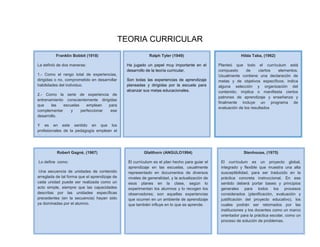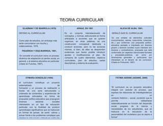 Este documento resume las perspectivas de varios teóricos sobre la teoría curricular. Franklin Bobbit definió el currículo como el rango total de experiencias dirigidas para desarrollar habilidades. Ralph Tyler consideró el currículo como las experiencias de aprendizaje planeadas por la escuela para alcanzar sus metas. Posteriormente, otros teóricos como Glatthorn, Stenhouse y González describieron el currículo como un proceso dinámico y flexible para guiar el aprendizaje y adaptarse al cambio social.