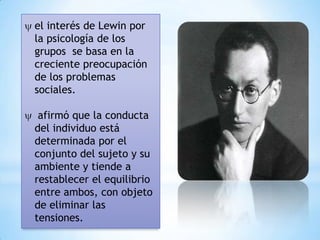 El documento resume las contribuciones de Kurt Lewin a la psicología de grupos. Sostuvo que el comportamiento de un individuo está determinado tanto por factores personales como ambientales, y que busca mantener un equilibrio entre ambos. Realizó investigaciones en 1938 sobre cómo diferentes estilos de liderazgo afectan la conducta de un grupo. Propuso la teoría del campo, en la que el comportamiento depende del todo formado por la persona y su entorno.