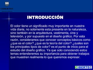 Este documento presenta una metodología para estudiar la teoría del color en el diseño gráfico. Explica conceptos básicos como el significado del color, la teoría del color y los principales tipos de color. Describe los modelos de color RGB, RYB y CMYK y sus aplicaciones. El objetivo es conocer estos temas para comprender la importancia del color en el diseño gráfico y crear trabajos que expresen efectivamente los mensajes deseados.