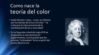 Este documento describe la historia y teoría del color. Explica que Isaac Newton descubrió que la luz blanca se compone de los 7 colores del arcoíris a través de experimentos con prismas en el siglo XVII. Más tarde, en 1960, los científicos descubrieron que el ojo humano contiene tres tipos de receptores de color sensibles al rojo, verde y azul, lo que forma la base de la teoría tricromática del color. Esta teoría explica cómo se pueden crear todos los colores mediante la me