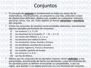 1) El documento presenta conceptos básicos de teoría de conjuntos como conjuntos, elementos, notación, conjuntos finitos e infinitos, igualdad, subconjuntos, conjunto universal, conjuntos disjuntos y diagramas de Venn. 2) También define operaciones con conjuntos como unión, intersección, diferencia y complemento y presenta ejemplos ilustrativos de cada una. 3) El objetivo es introducir estos conceptos fundamentales de teoría de conjuntos que son una base para el estudio de la estadística y la probabilidad.