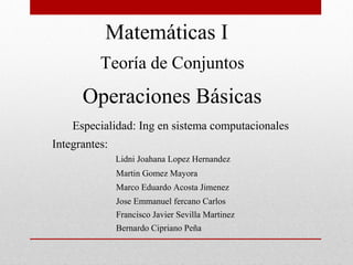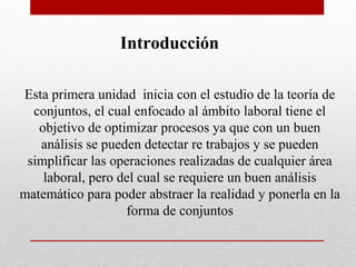 Este documento presenta la teoría de conjuntos y operaciones básicas. Introduce conceptos clave como elementos, subconjuntos y operaciones entre conjuntos como unión e intersección. Explica cómo determinar conjuntos mediante extensión o comprensión y tipos de conjuntos como finitos e infinitos. Finalmente, ilustra el uso de operaciones de conjuntos para resolver un problema sobre la producción de dos productos en una cervecería.