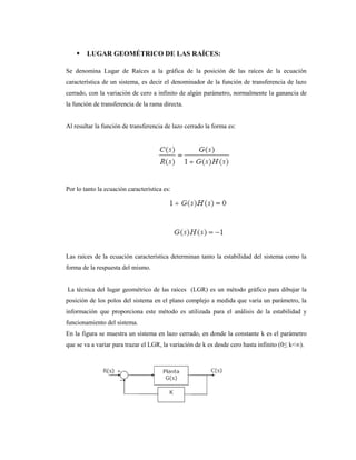 Este documento describe el lugar geométrico de las raíces (LGR), un método gráfico para analizar la estabilidad de un sistema de control. Explica cómo dibujar la posición de los polos de un sistema a medida que varía un parámetro, como la ganancia. También cubre las características del LGR, como que inicia en los polos y termina en los ceros del sistema, y es simétrico con respecto al eje real. Finalmente, muestra cómo trazar el LGR de un sistema de ejemplo usando MATLAB.
