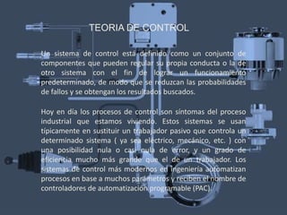 Este documento trata sobre los sistemas de control. Define un sistema de control como un conjunto de componentes que pueden regular su propia conducta o la de otro sistema con el fin de lograr un funcionamiento predeterminado y reducir los errores. Explica que los sistemas de control se usan comúnmente en procesos industriales para automatizar tareas en lugar de trabajadores, mejorando la eficiencia. Finalmente, señala que el uso generalizado de controles automáticos en la industria ha creado la necesidad de capacitar a más trabajadores para el manejo y mant