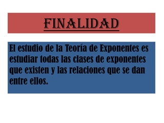 Este documento presenta las leyes fundamentales de la teoría de exponentes. Explica que los exponentes se utilizan para estudiar cantidades conocidas y desconocidas representadas por números y letras. Luego describe las cuatro leyes básicas de los exponentes: 1) producto de potencias de la misma base, 2) cociente de potencias de la misma base, 3) potencia de otra potencia, y 4) potencia de un producto o cociente de factores. Finalmente, cubre exponentes fraccionarios, negativos, y potencias de exponentes.